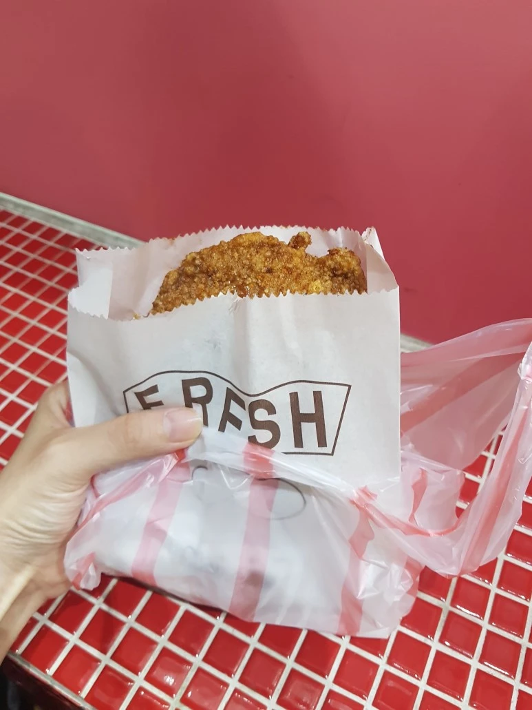 지파이 한 입 먹었는데 약간 매콤하면서도 달달한 맛이 느껴졌다.