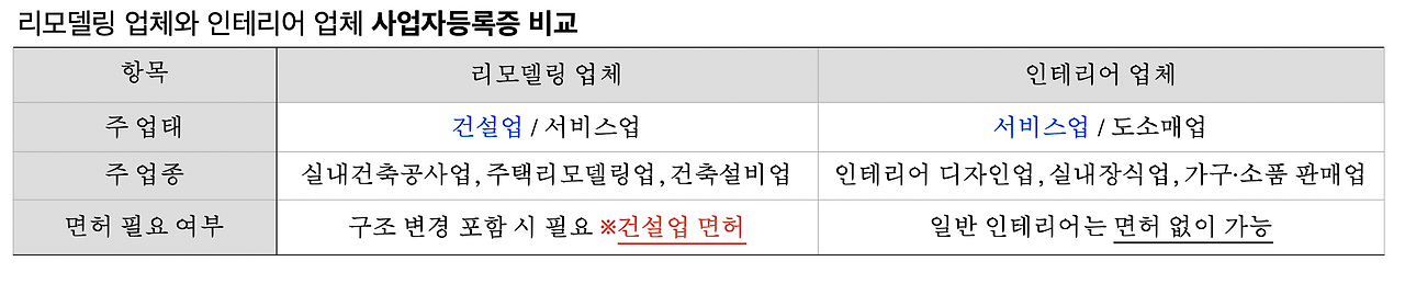 그러니까 우리 부부가 원하는 것은 리모델링이었다. 리모델링 업체와 인테리어 업체는 차이가 있다. 가장 중요한 차이는 건설업의 등록 여부인데 이것을 볼 수 있는 방법은 견적을 받을 때 사업자등록증을 요구하면 된다. 사업자등록증은 장사를 하는 사람들에게는 주민등록증 같은 것이라 기본적으로 제시해야 하고 요구할 수 있는 서류다.