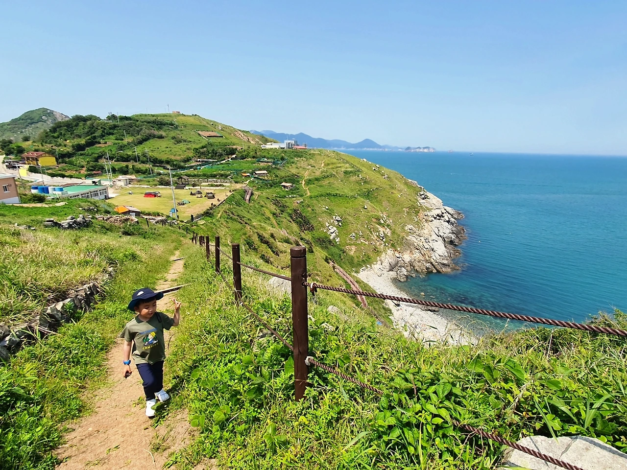 달콤한 캐러멜을 입에 넣고 오물거리며 언덕을 오르기 시작했다. 완만한 언덕길을 따라 20여 분 올라오니 등 뒤로 매물도 야영장의 전경이 펼쳐졌다. 마치 드론으로 항공 촬영을 한 것 같은 멋진 뷰를 감상하고 있는데, 저 멀리 빨간색 캡모자를 쓴 꼬마가 점차 가까워져 오는 게 어렴풋이 보였다.