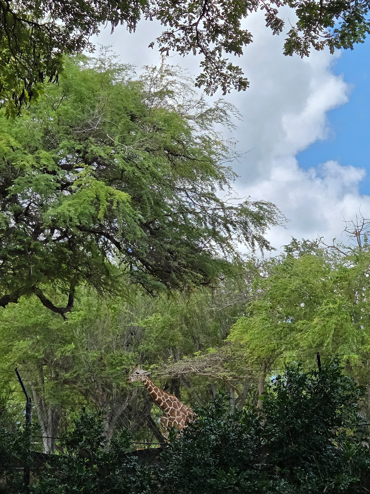 그래도 우린 맛집 찾기에 진심인지라 걸어야 할 땐 또 열심히 걸었다. 햇빛은 강했지만 습도가 높지 않아 더할 나위 없이 쾌청했다. 나무 그늘에만 들어서면 신기하게 서늘한 느낌마저 들었다. 언젠가부터 내 갤러리 폴더에 나무 사진이 많아졌다. 난 오래오래 뿌리를 내린 나무들을 볼 때마다 그 놀라운 생명력과 하늘 향해 쑥쑥 가지를 뻗어간 그 모습이 아름다워 카메라에 담는다. 그러다 쑥, 동물원 근처에서 고개를 내민 기린 선생도 만났다.