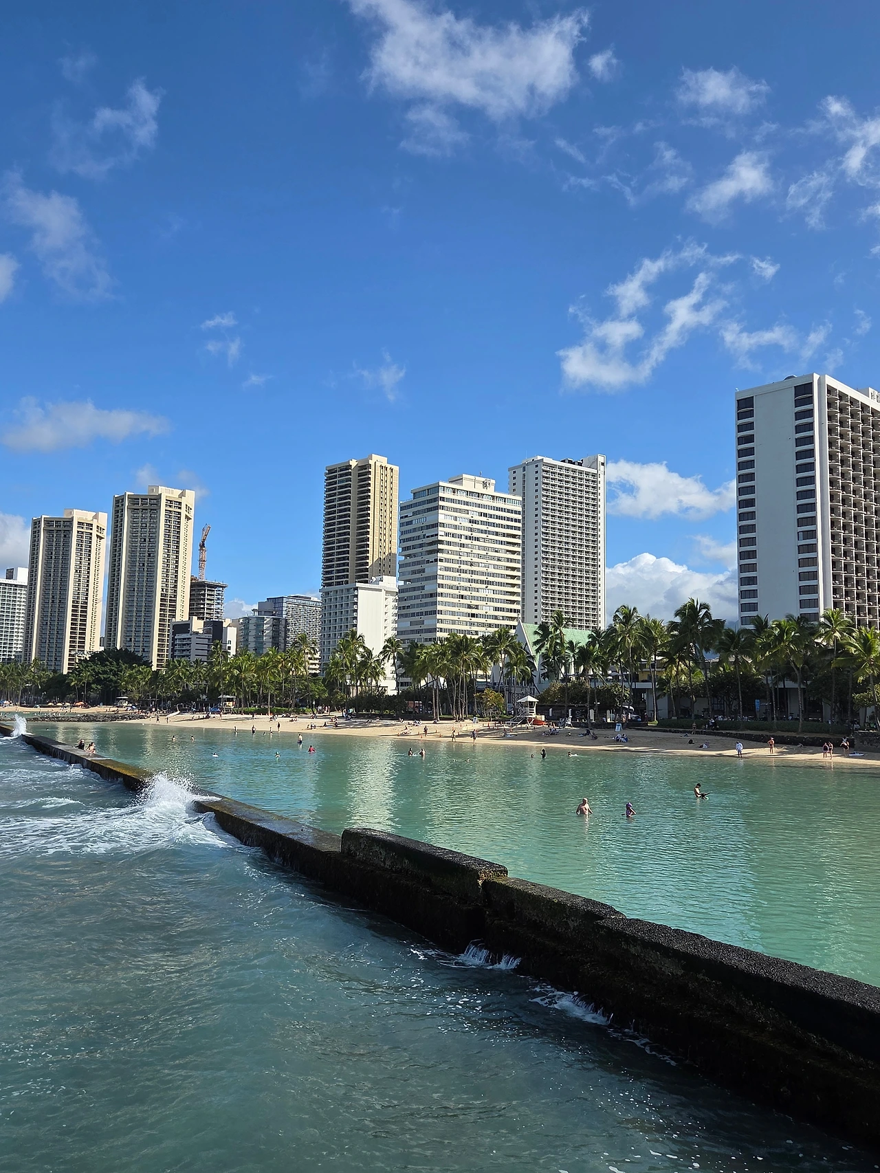 2주 차에 머문 하얏트 센트릭 와이키키비치는 산책하기 좋은 위치에 있다. 호텔에서 나와 오른쪽 방향으로 조금 걷다 보면 바닷가와 나란한 길이 나온다. 그 해변 길을 따라 죽 걷기만 하니 길치여도 다녀올 만하다. 어느 날 아침, 큰 맘을 먹고 혼자 산책하러 나왔다. 더 이상 미루다가는 후회할 것 같았다. 예상대로 이른 아침의 공기는 청량하다. 이렇게 바다를 바라보며 천천히 걸으니 며칠 전에 갔던 다이아몬드헤드까지도 거뜬히 올라갈 수 있을 것 같다. 해변엔 서퍼들뿐 아니라 태양이 뜨거워지기 전에 수영을 즐기는 관광객들이 생각보다 많았다.