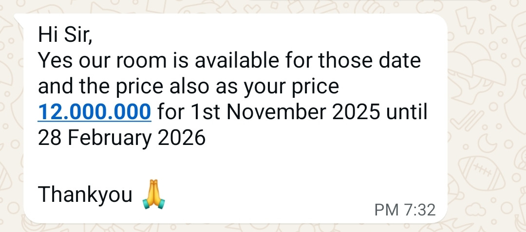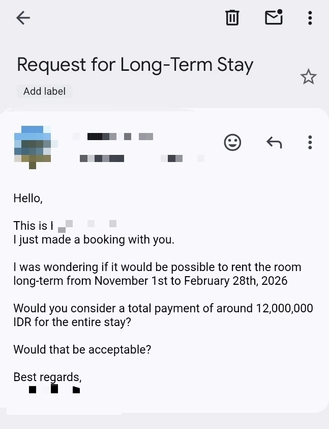 그러고 3분 동안 고민했다. 뭐라고 쓰지? 좀 오래 머무를 테니 할인을 해달라는 건데... 가격은 어느 정도를 제시하지? 고민 끝에 40% 정도 할인된 가격을 제안하기로 했다. 4개월에 1,200만 루피아(약 102만 원). 그리고 이 내용을 챗지피티에 번역을 돌려 메일 본문에 붙여 넣고 전송했다.