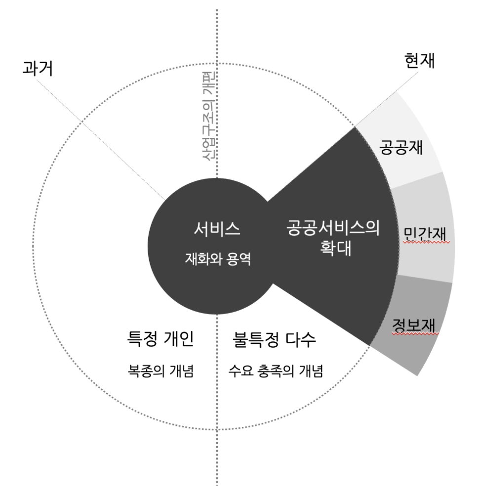 서비스는 라틴어로 세르부스, 세르비티엄과 같이 사회적 배경에 따라 특정 계층을 위한 봉사행위를 통칭 하고 있었다. 그러나 18,19세기 남북전쟁을 거쳐 산업구조의 개편을 통해 불특정 다수를 위한 수요 충족의 개념으로 전환되었다. 이는 공공서비스의 확대를 의미하고 공공서비스에는 공공주도의 공공재, 민간 참여의 민간재, 소비 생산과 재분배를 의미하는 정보재가 있다.