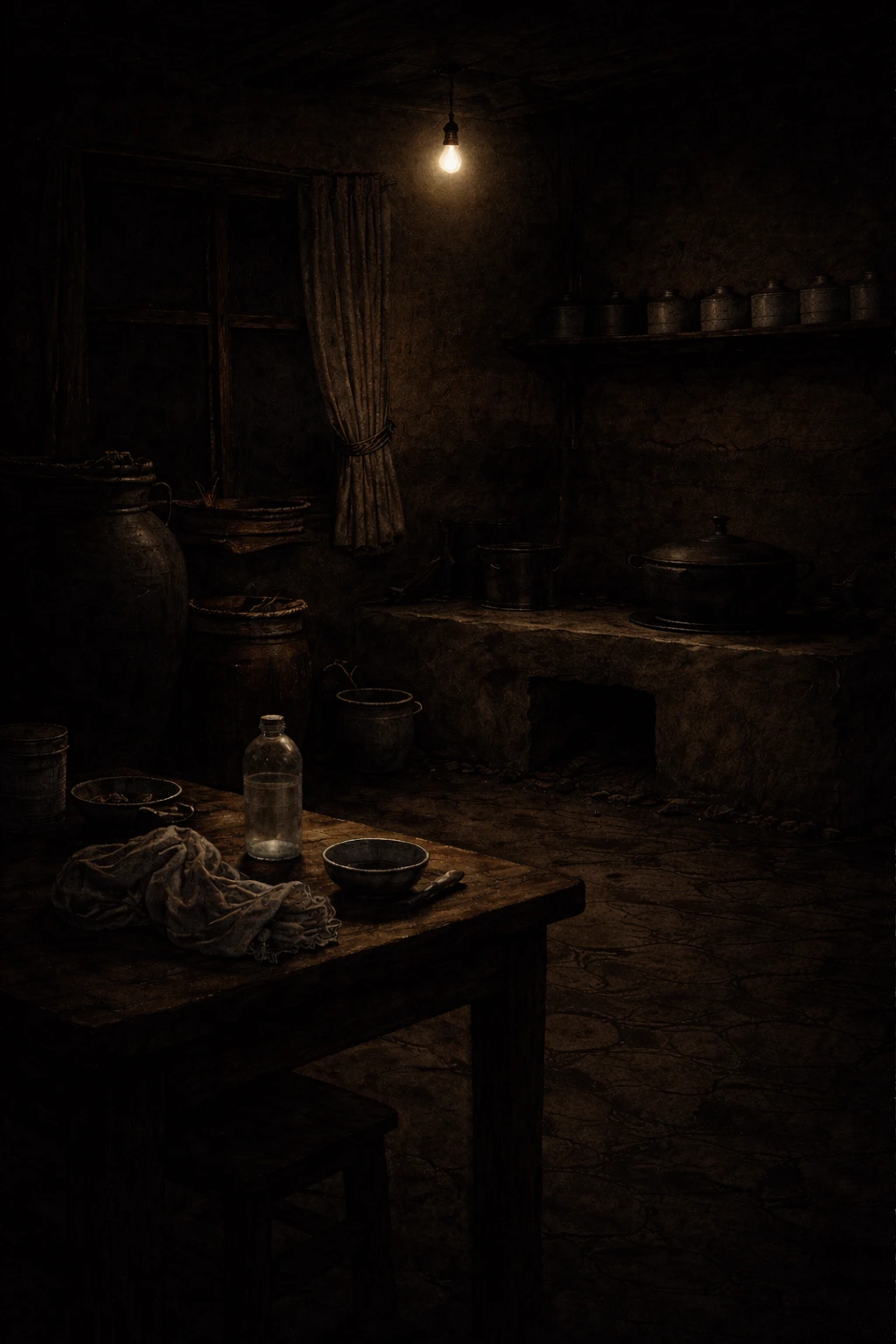 적산가옥의 부엌은 5촉 전구 하나가 시커멓게 그을린 공간을 간신히 밝히고 있다. 크다란 물항아리가 벽에 붙어 놓여있고, 키 높은 나무 선반이 부엌문을 향해 가로지른다. 투박한 나무 살, 유리 없는 창에는 도막 난 빛이 한 뼘 남짓 매달려 있다. 헐겅하게 빗장 거는 부엌 문 틈엔 수시로 삭풍이 드나든다. 벽에 걸린 연탄 보일러는 빨간 플라스틱 주머니에다 물을 삶는다.