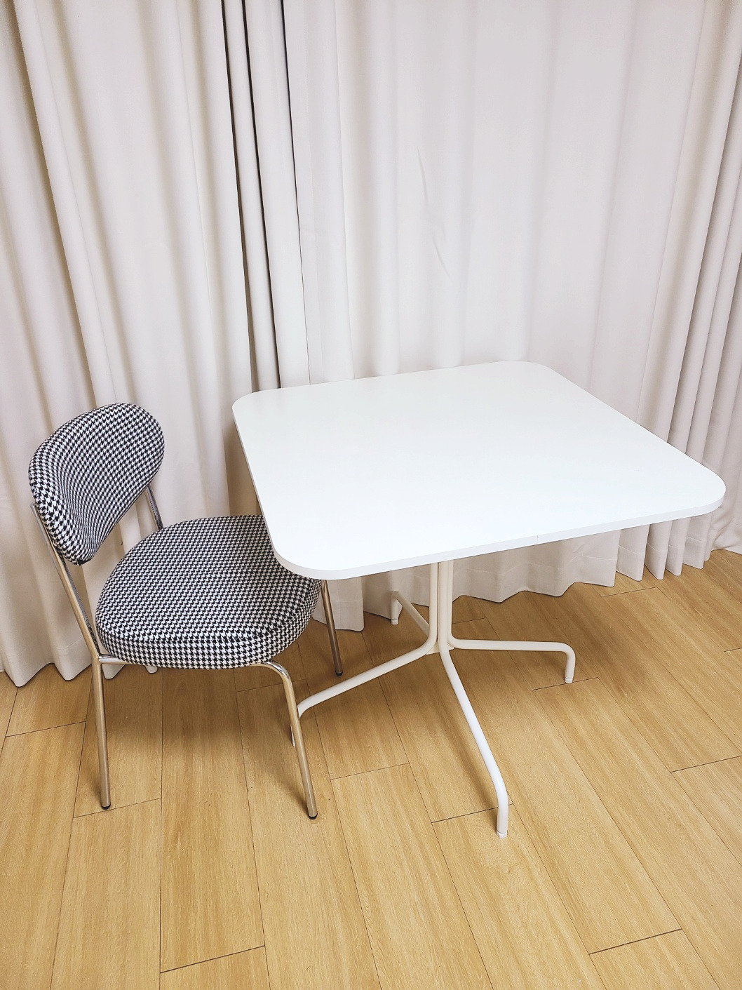 식탁과 의자는 당근에서 원하는 걸 구하기 애매해서 새 것으로 구매했는데, 나름 미드센추리 가구를 구매했지만 텅 빈 공간에 저것만 달랑 있어서 그런지 가족들이 편의점 테이블 같다고 놀려댔다.