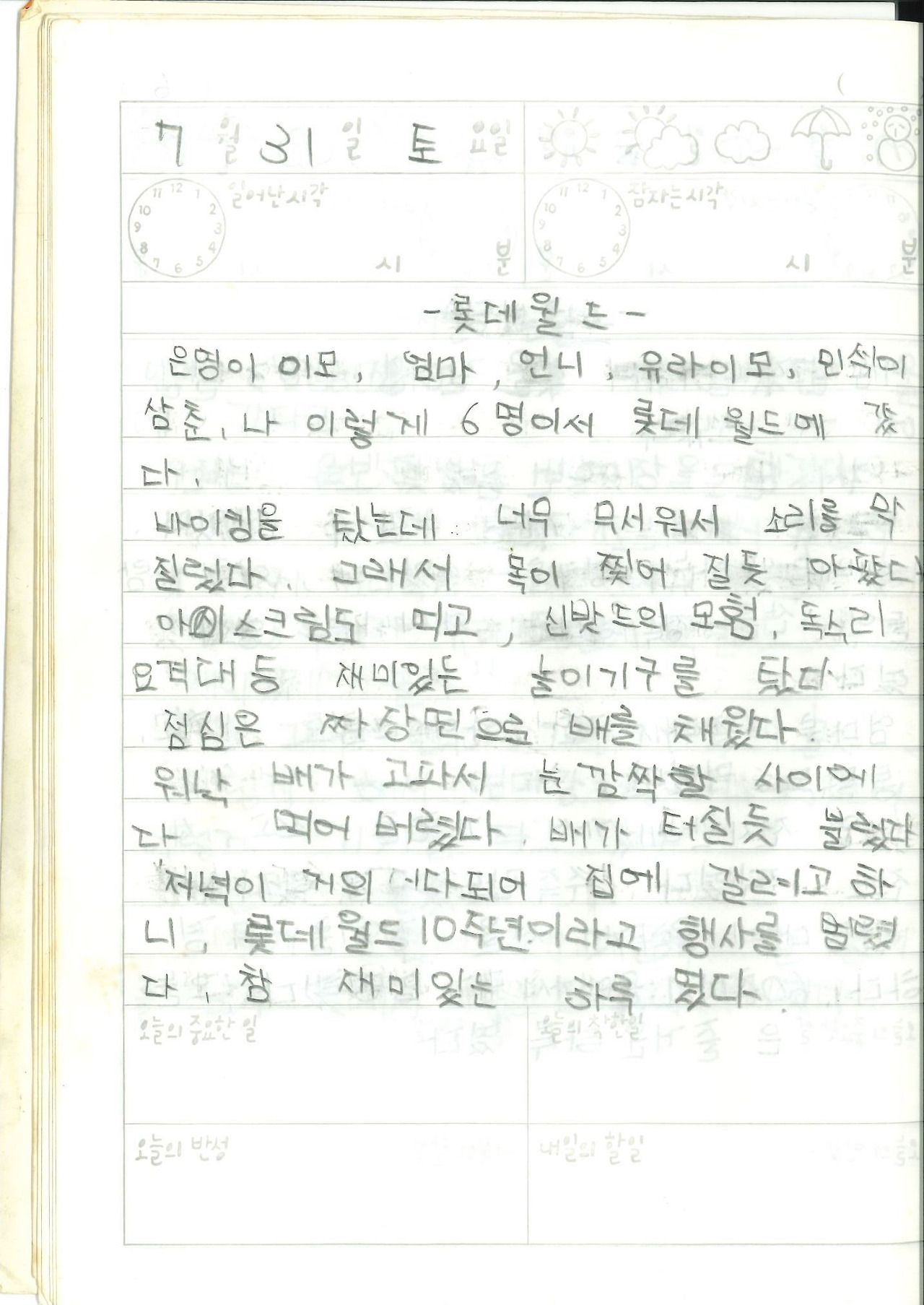 전후 일기를 살펴보니 서울할머니(증조할머니), 엄마, 언니, 나의 2박 3일 서울여행이었다. 서울 고모할머니집(서울할머니의 둘째딸)에 서울할머니를 모셔다 주러 간 것 같다. (한동안 서울할머니가 서울에서 지내다 오신다는 내용이 다음 장에 나온다.) '작은 나'는 첫날 63빌딩에, 둘째날 롯데월드에 다녀왔다. 63빌딩에서 가면전시관, 수족관, 전망대를 다녀오며 구슬아이스크림을 먹었다고 “즐거운 하루”라고, 롯데월드에서 온갖 놀이기구를 타고 짜장면을 먹었다고 “재미있는 하루”라고 말하고 있다. 높아봐야 고작 2층 짜리 건물이 다이고 화려해봐야 횟집 네온사인 등이 전부인 노량리 어린이에게는 매 순간이 글로 표현하기 어려울 정도로 황홀한 장면이지 않았을까. 이제야 알겠다. 내가 서울을 좋아하는 이유를. 내 생애최초로 본, 놀 것 많고 맛있는 거 많은 도시이니까.
