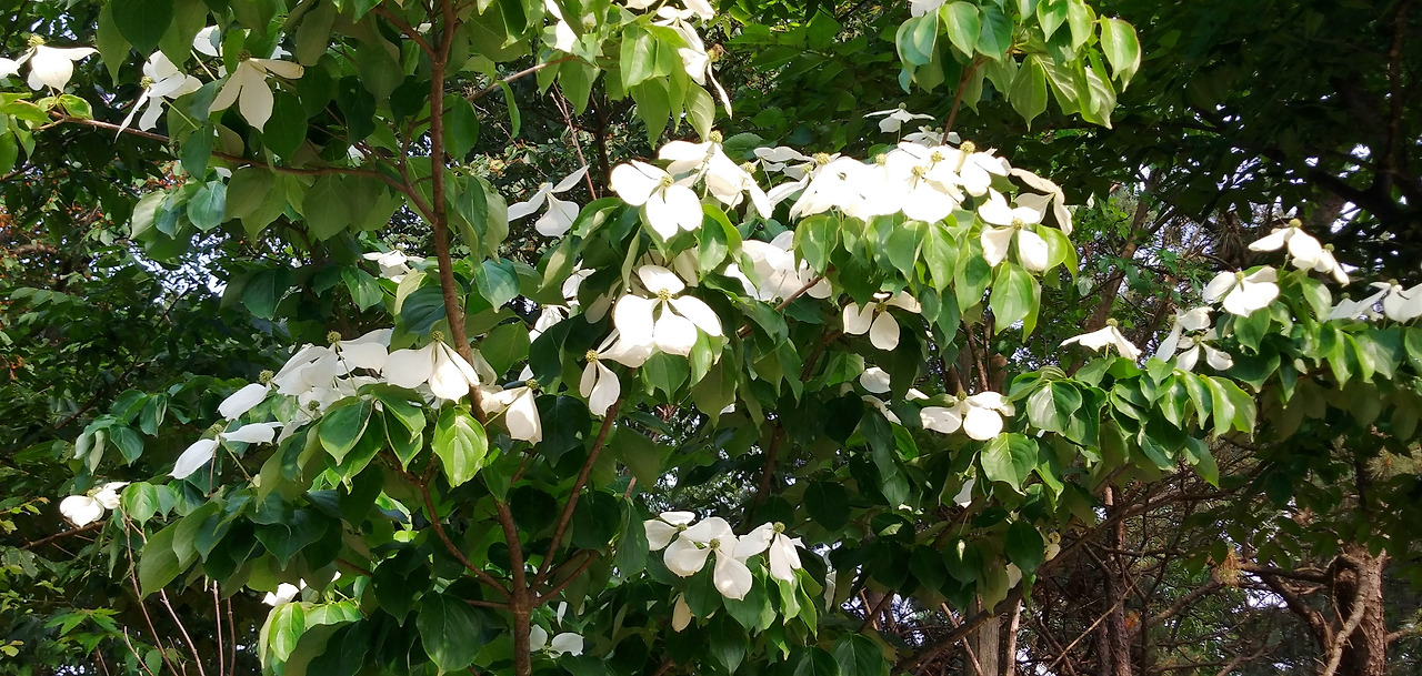 이 나무는 산딸나무예요. 산딸나무의 꽃잎은 4장으로, 순수하다는 느낌이 들어요.