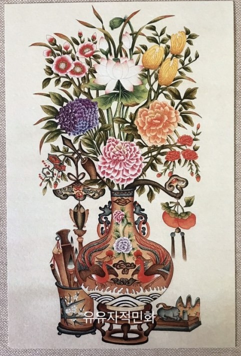 화병도는 화려하게 핀 꽃이 다양한 형태의 화병·화분에 줄기를 드러낸 채 꽂혀있거나 심어진 모습이 흔하다. 작가에 의해 화병에서 불려나온 것들은 마치 중동의 설화 《알라딘과 요술 램프》에서 세 가지 소원을 들어주는 램프의 요정 지니처럼 보인다. 램프를 문지르듯 화병도를 그리며 소망을 피워낸 정정혜 작가의 그림이야기를 들어본다. (편집자주) 화병도는 십장생도나 백학도처럼 크고 화려하지 않지만, 그 작은 세상에서 삶의 모든 소망을 피워낸다. 화병의 ‘병甁’과 평안의 ‘평平’은 중국식 발음이 같아 화병은 곧 평안을 상징한다. 화병에 부귀를 상징하는 모란이 꽂혀있으면 평안부귀平安富貴를 뜻하고, 불수감·석류·복숭아를 조합하면 다복다수다남자多福多壽多男子를 의미가 더해진다. 우리 선조들은 화병도로 집을 장식하면 가정에 평안과 온갖 복을 가져다준다고 여긴 것이다. (출처 : 월간 민화 , 정정혜-작가의-화병도-이야기-소망을-피워내는-작은)