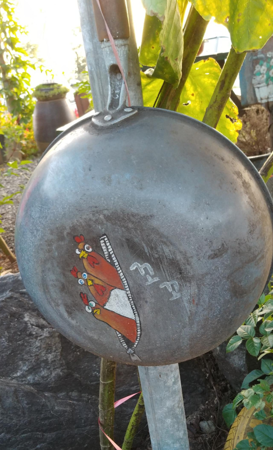 마당을 나온 암탉의 모습이 보이는 듯해요. 궁중팬 뒷면에 닭들을 그려놓으셨고, 궁중팬 속에서 나온다는 느낌으로 지퍼를 그려놓으셨어요. 아이디어가 너무 좋으신 듯해요. 예술가적 기질이 많으신 듯해요.