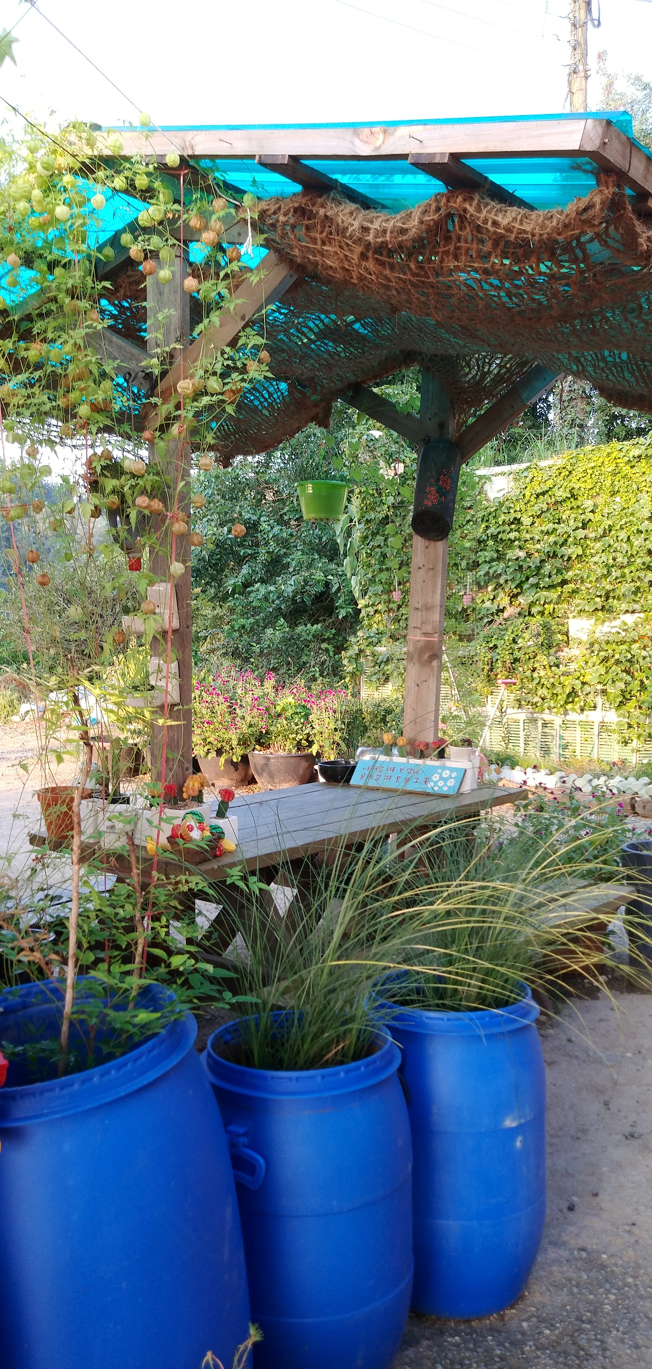 쉼터 천장에서 내려오는 식물은 풍선초(풍선덩굴)인데, 이름 그대로 풍선처럼 속이 비어 있으며, 덩굴로 자라는 덩굴식물이에요. 열매는 풍선 안에 들어 있는데, 모양이 하트 모양이에요. 열매가 하트 모양이라 무척이나 신기해요. 풍선초의 꽃말은 "어린 시절의 재미, 당신과 날아가고파"에요.