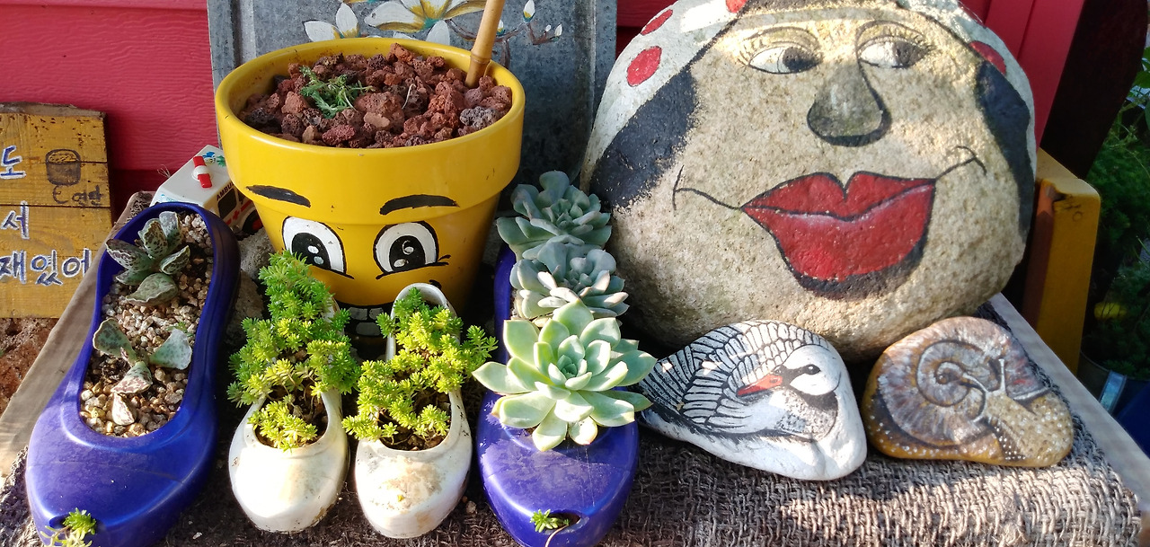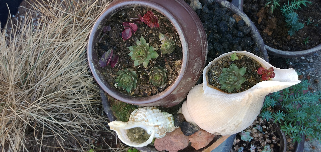 이번에는 소라껍데기와 물통이 멋있는 화분으로 변신했네요. 식물은 다육이 종류인 듯해요. 다육이는 잎 하나로도 새로운 개체가 다시 생길 수 있어요. 이런 모습이 너무 과하지 않고 잘 어울린다는 느낌이 들어요.
