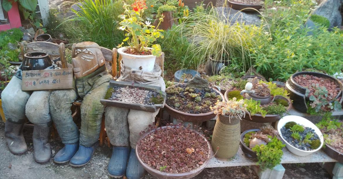 여기는 더 이색적인 곳이네요. 바지와, 장화를 신은 식물이네요. 깨진 항아리도 여기서는 그 나름의 역할을 하며, 어울리는 모습이 좋은 듯해요.