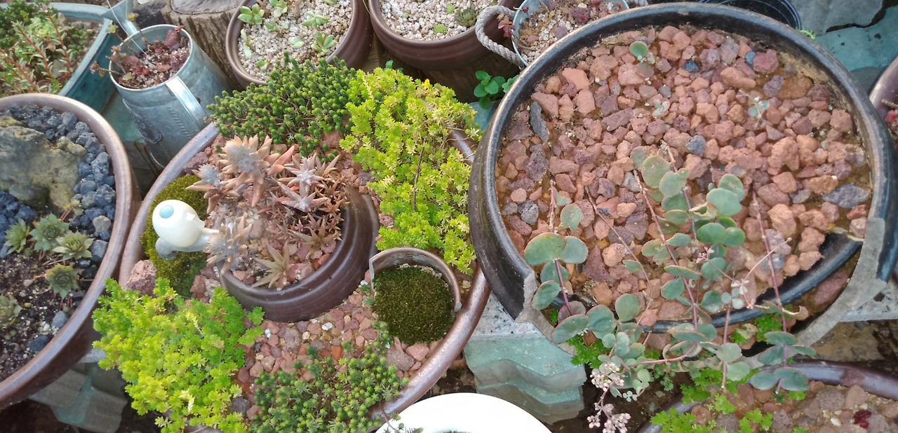 여러 모습의 화분과 식물이 잘 어울리는 듯해요. 여기도 깨진 화분이 자신의 역할을 다하고 있네요.