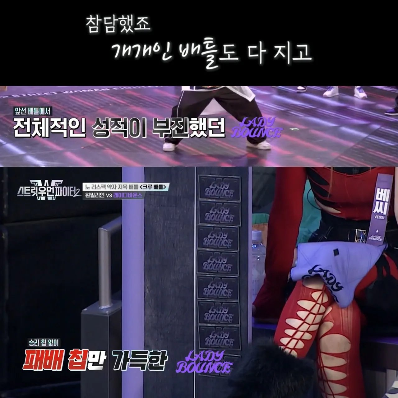 그러나 안타깝게도 그들의 개개인 배틀 성적은 좋지 않았다. 모든 팀원이 완패를 했고, 그 결과 댄스배틀 결과를 알리는 알림판에는 '패배'에만 칩이 가득했다.