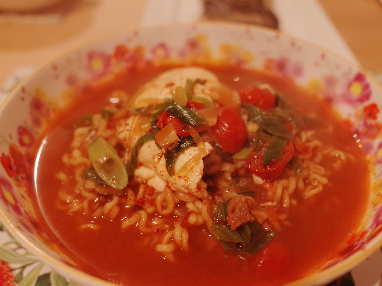 집에 남은 토마토와 액젓을 추가해서 끓은 라면. 채 썰은 양배추는 바닥에 숨어있어요!
