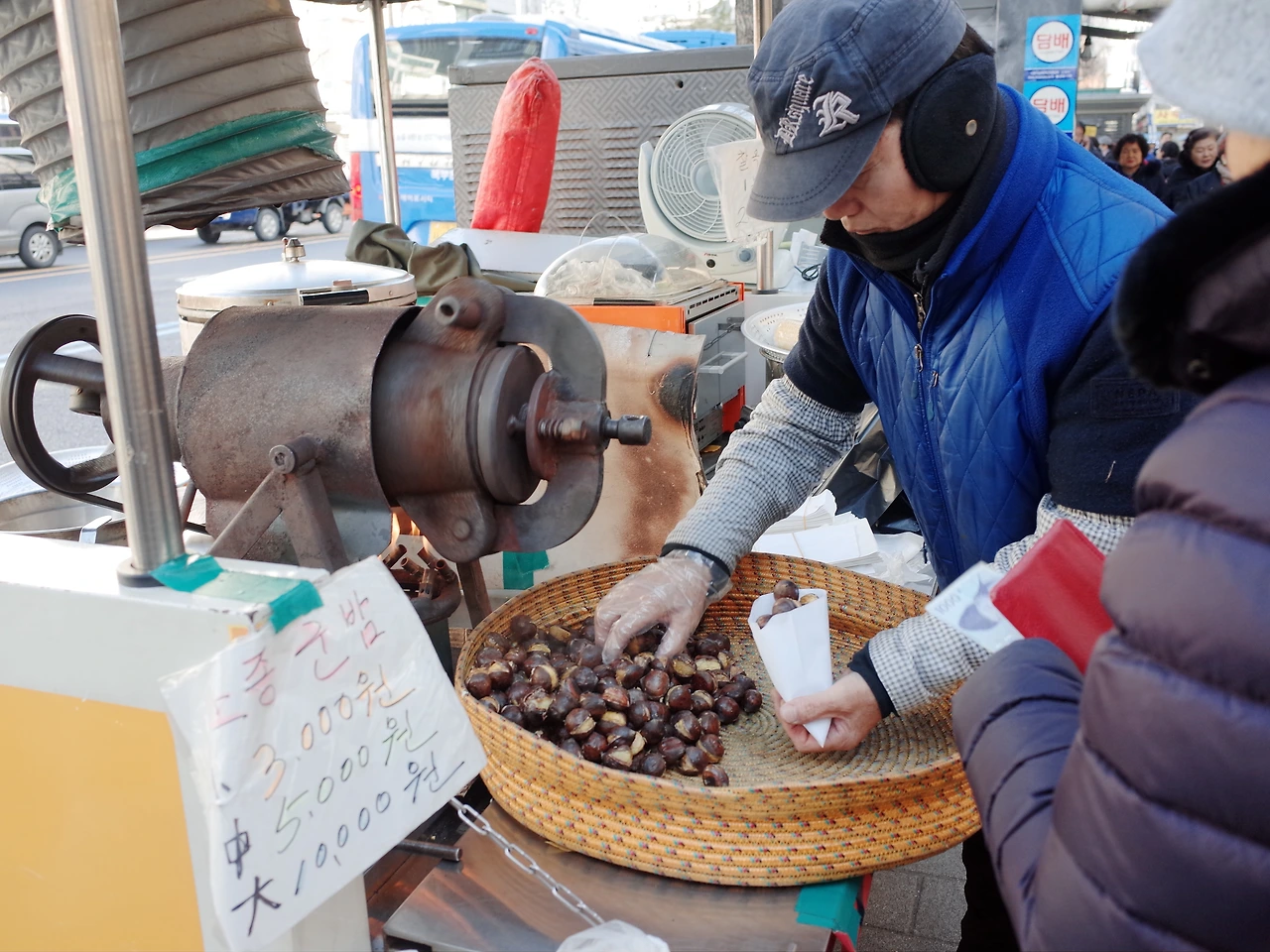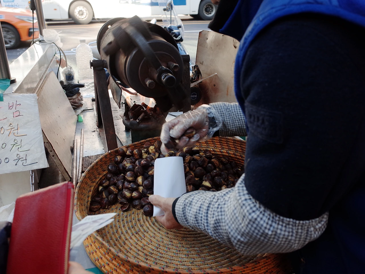 엄마랑 명동 길거리에서 눈 오는 날, 노란 털실처럼 가느다란 고구마튀김과 함께 집어 들었던 이면지로 만든듯한 군밤 봉지의 온기를, 유난히 볼이 뽀얗게 통통했던 남동생이 쓰면 귀부터 얼굴이 폭 가려졌던 털이 포실포실한 올리브색 군밤 장수 모자를, 엄마와 천 원짜리 세장을 손에 들고 기다리며, 돌돌돌 돌아가는 뻥튀기 기계에서 터져 나오는 그 구수한 군밤 냄새를, 요즘 아이들은 아마도 모를, 군밤이 구워지는 동안 새까만 연탄불의 구멍에서 반딧불이가 숨어있는 듯, 그 아주 작은 노랗고 빠알갛게 삐져나오는 연탄 불빛을 생각해봅니다.