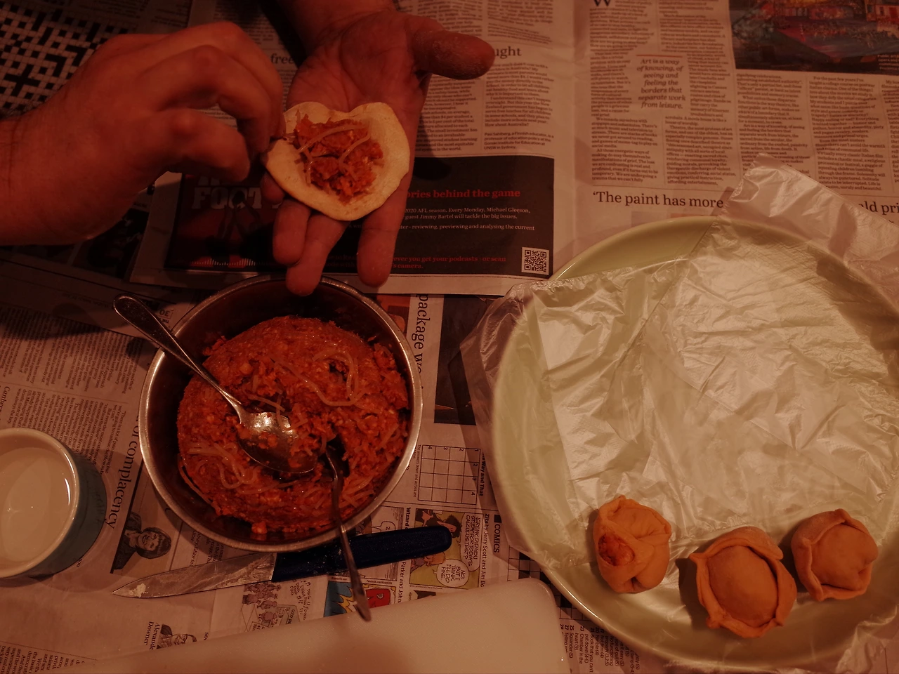 이튿날, 늦지막 하게 고랑이와 오후 티타임을 가진 뒤 바닥에 신문지를 깔고, 나무 도마와 밀대, 밀가루를 준비했어요. 저와 고랑이는 만두피를 밀고, 대화를 하면서 만두를 빚기 시작했어요.
