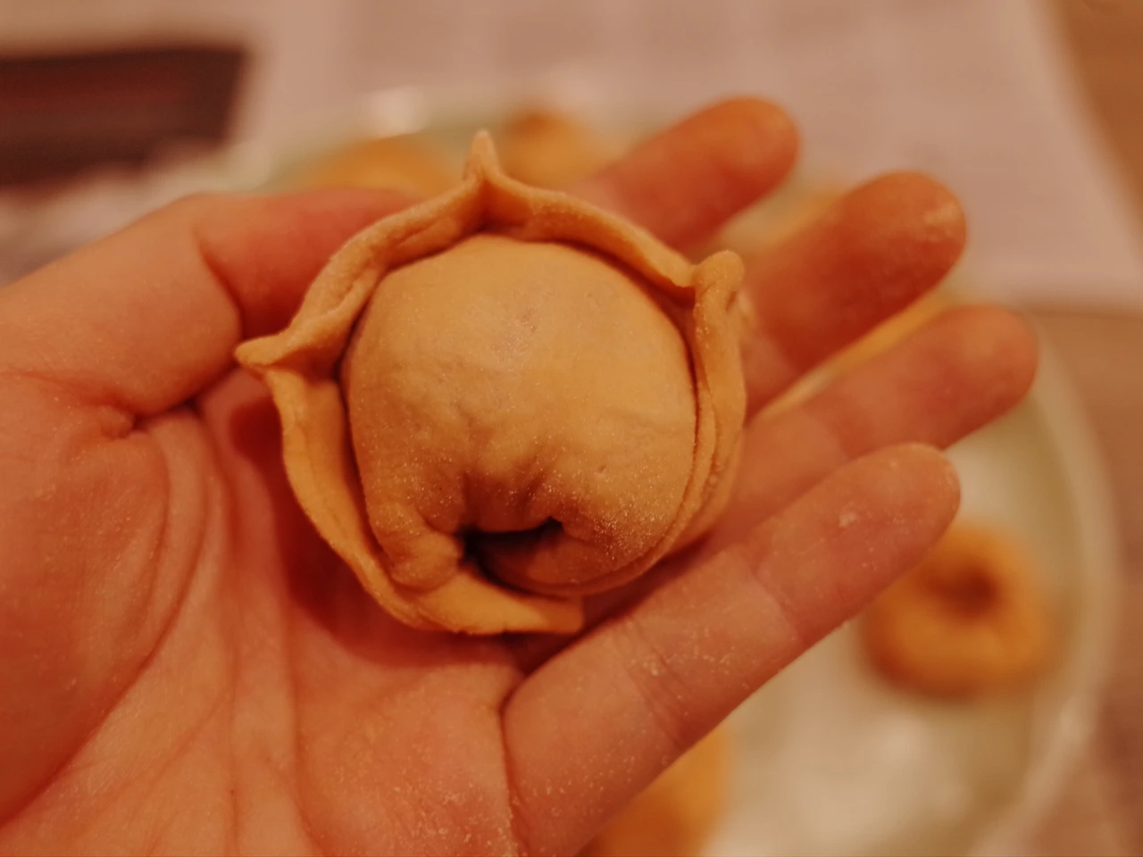만두에 얽힌 저와 엄마와의 추억, 그리고 만두의 기원인 제갈량의 이야기, 고랑이가 이탈리아 논나(할머니)와 일할 때 있었던 이야기들, 여기 마트에서 사 먹은 덤플링이 플라스틱 맛이 나서 몽땅 버린 이야기, 그리고 '만두를 예쁘게 만들면 예쁜 딸을 낳는다'는 말 까지. 그런데, 이 프랑스 남자. 만두를 만들고 싶다고 하더니 이탈리아식 토르텔리니(이탈리아식 작은 만두 모양의 파스타 )를 만들어놨네요.