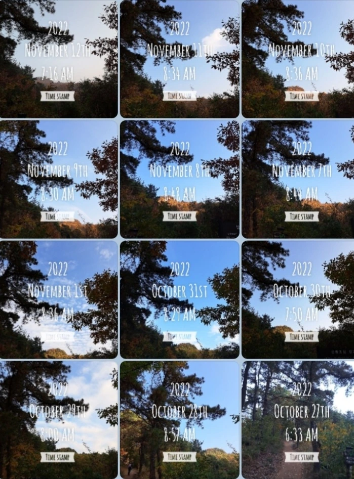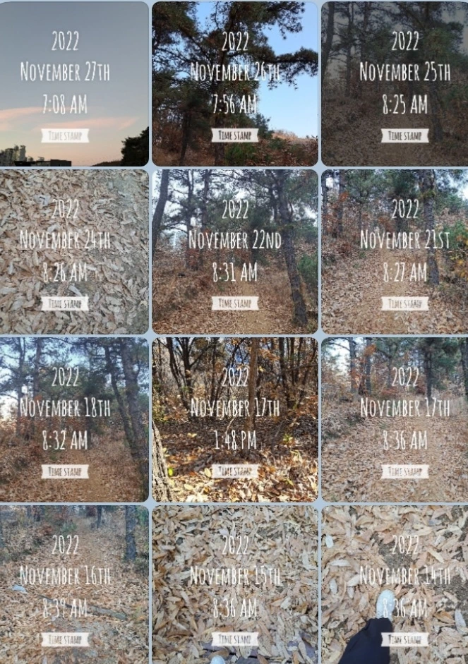 소요 시간을 정한다. 매일 한 시간 반 정도. 우리 집에서 산 초입까지 10분, 무리하지 말고 일단 10분만 올라간다. 등산이 10분, 내려오는데 10분, 다시 동네를 지나 우리 집까지 10분이다. 10+10+10+10=40분