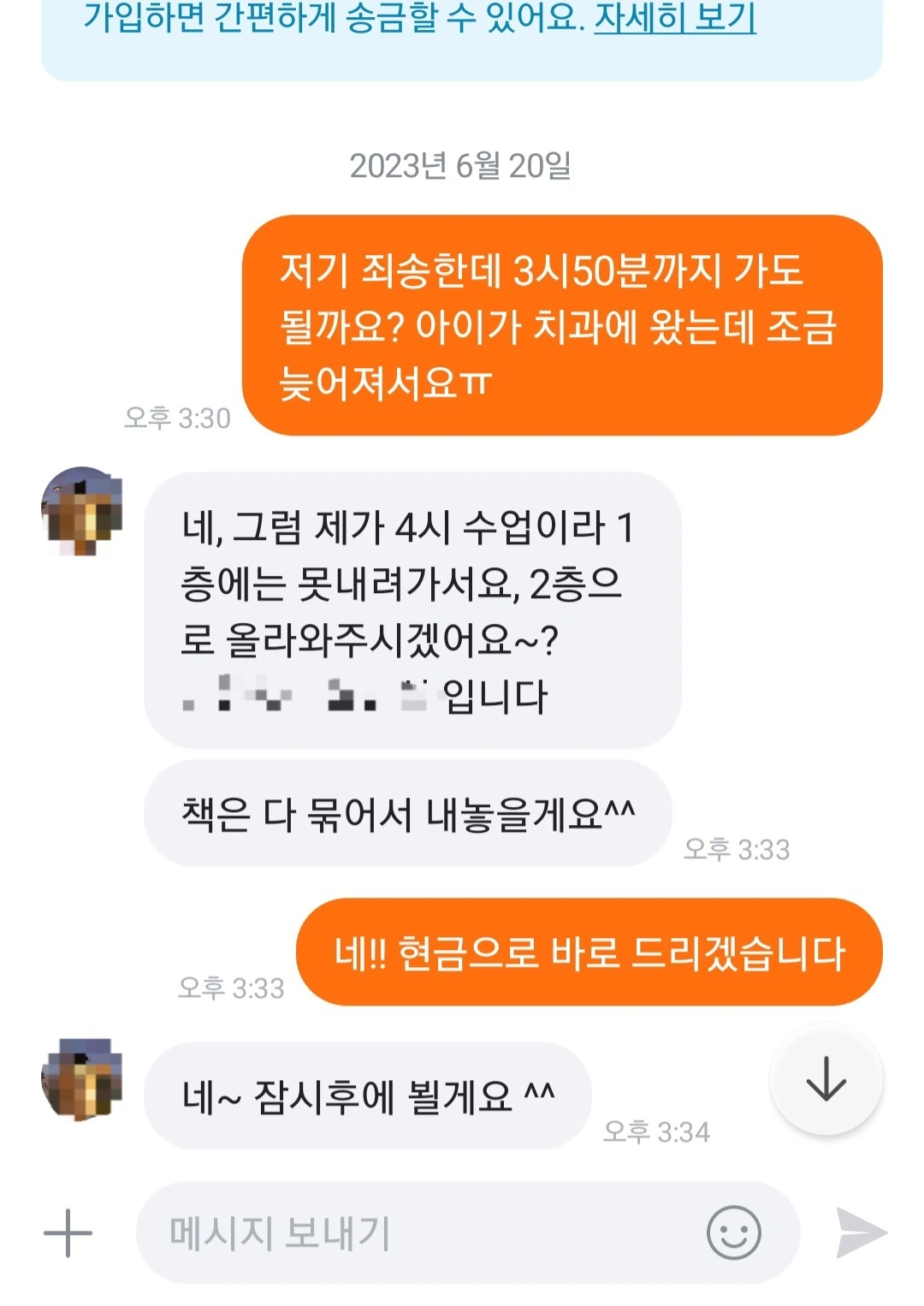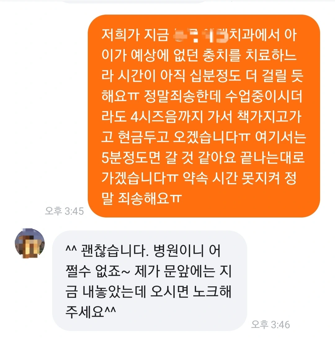“저희가 지금 **치과에서 아이가 예상에 없던 충치를 치료하느라 시간이 아직 십분 정도 더 걸릴 듯해요. 정말 죄송한데 4시 즈음까지 가서 책 가지고 가고 현금 두고 오겠습니다. 여기서는 5분 정도면 갈 것 같아요. 끝나는 대로 가겠습니다. 약속 시간 못 지켜 정말 죄송해요.”