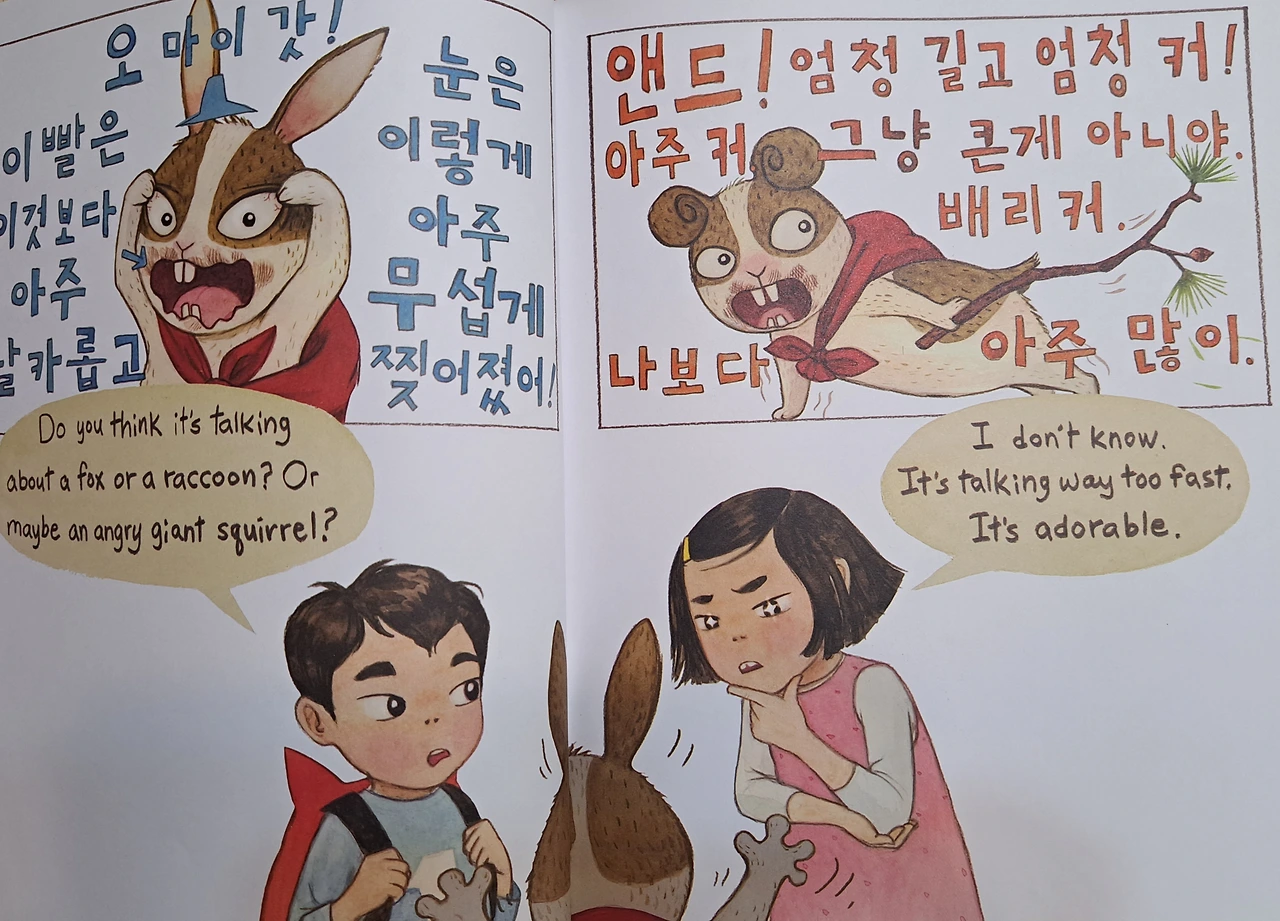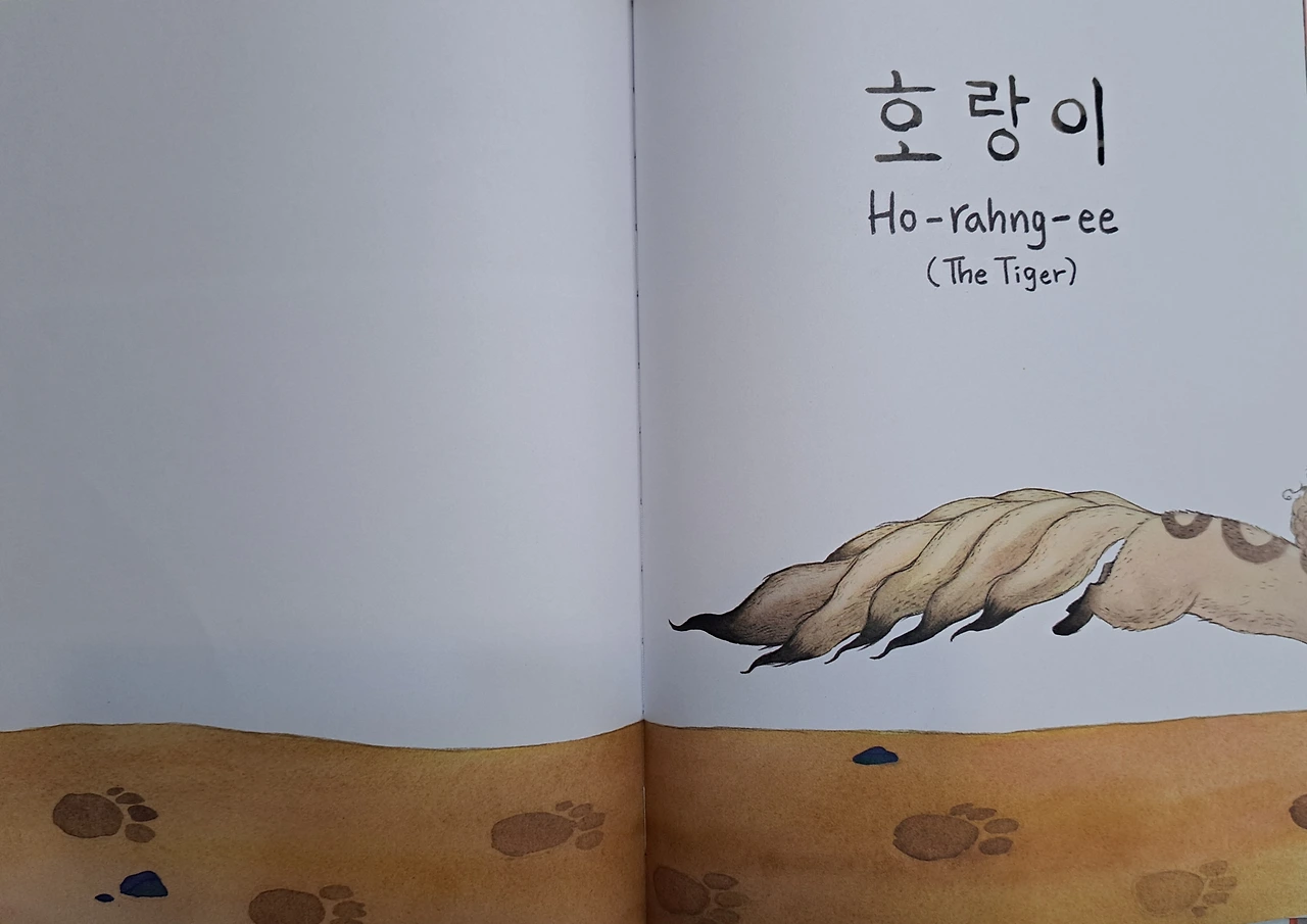 위와 같은 단어를 영어로 적어 놓은 걸 보면 한글인데도 낯선 묘한 이미지가 연출된다. 어쩌면 영어로 표기되어 더 한국적인 정서를 느끼게 하는 작용이 세게 오는지도 모르겠다. 아이 원서를 자주 빌려서 보는데 외국인 작가가 쓴 것도 그 나름의 매력이 있지만, 이 책은 외국에 사는 한국인이 영어로 한국적인 소재를 써서, 이야기를 풀어내는 책이었다.