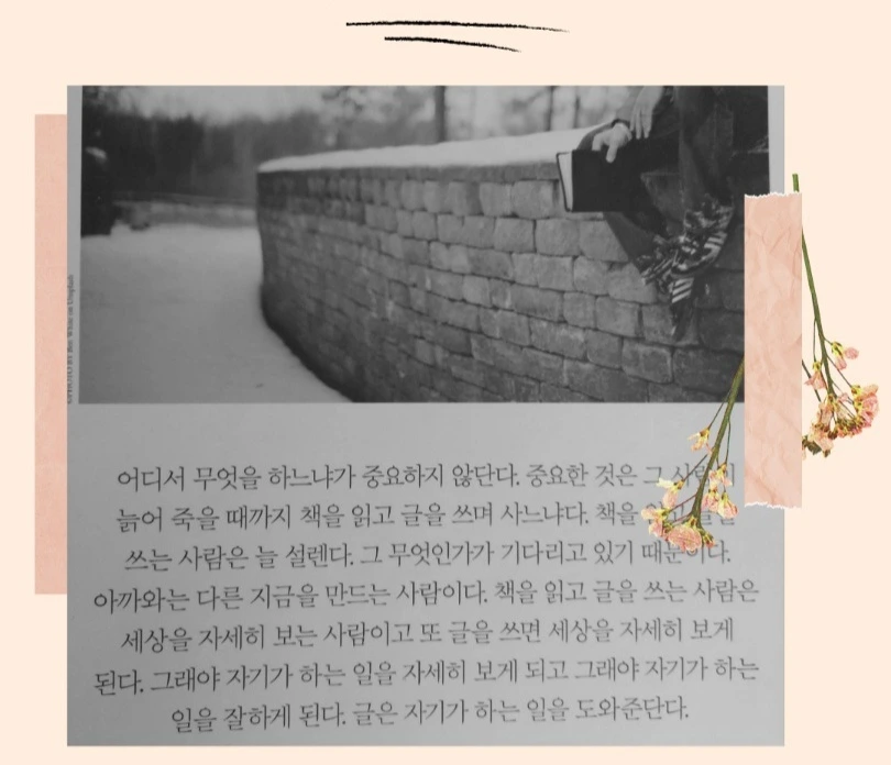 도움이 안 될거라 싶어 메모하거나 체크해두지 않고 읽었던 문장들이 갑자기 생각나 쓰는 글의 방향을 잡기도 한다. 그래서 내 글은 대부분 제목과 첫 모티프가 먼저 있고, 그 외의 것들은 계속 바뀐다. 글 쓰는 스타일이 지금은 그렇다.
