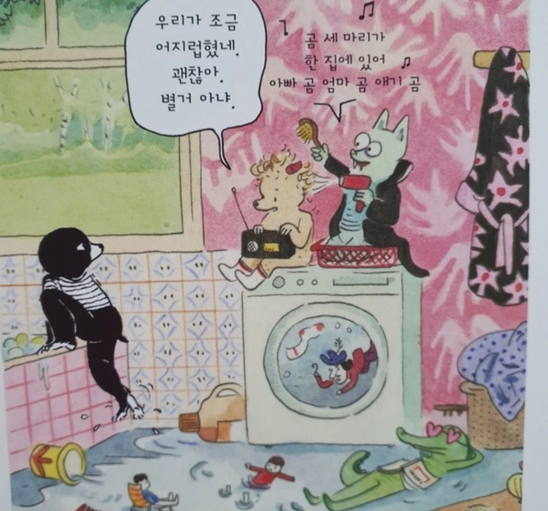 두더지 아이, 고양이 아이가 심심해서 숨바꼭질을 하는데, 숨기 위해 일단 큰 창문 밖으로 나간다. 집에서 자연으로 막 뛰어 들어갈 수 있는 구조다. 나가면 바로 정원과 들판이 이어지는 숲세권. 부럽다. 얘들은 수시로 들락날락하겠구나. 아파트와 다르다.