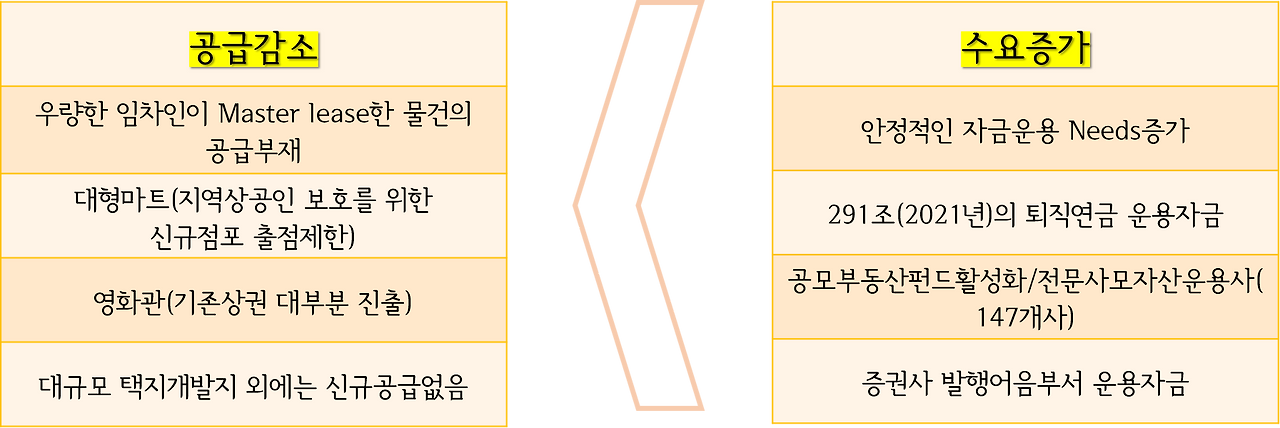 또한, 대출형이 아닌 지분형 투자 시 매매차익을 기대할 수 있다는 장점이 있습니다. 수익형 부동산의 경우 수요에 비해 비교적 공급이 제한적인 경우가 많습니다. 앞서 언급했듯이 퇴직연금 등 기관투자자의 자금 규모는 커져가는 데 반해, 안정적으로 자금을 운용할 수 있는 우량 채권의 수익률이 낮아짐에 따라 수익형 부동산에 대한 투자수요가 점차 증가할 전망이 크기 때문입니다.