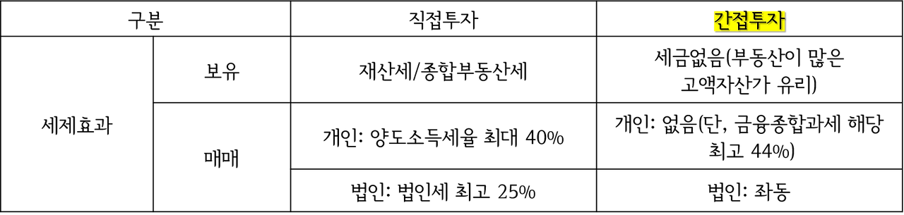 부동산 간접투자의 첫 번째 매력은 세제효과가 있습니다. 부동산 직접투자에 발생하는 재산세 및 종합부동산세, 양도소득세(최고 40%)가 발생하지 않습니다. 단, 배당이나 이자수익이 발생하면 금융종합과세(최대 44%)만큼의 세금이 붙을 수는 있습니다. 따라서, 부동산 간접투자는 고액자산가나 보유자산 중 금융자산에 비해 부동산의 비중이 많은 사람에게 보다 더 유리합니다.