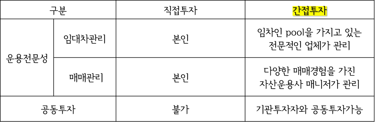이 보다 더 큰 장점은 기관투자자와 공동투자가 가능하다는 점입니다. 기관투자자의 경우 투자자금의 규모가 크고 매매경험이 많기 때문에 전문성이 있는 투자주체입니다. 이처럼 우량 투자자와 공동투자를 한다는 것은 그만큼 투자자산에 대한 신뢰성을 확보할 수 있다는 것을 의미합니다.