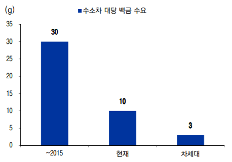 다만, 꾸준한 기술개발을 통해 수소차 1대당 함유되는 백금의 양이 조금씩 줄어드는 추세입니다. 디젤차 1대 당 백금이 3g~7g 정도 소요되는 것으로 추정됩니다. 그런데 수소차 1대 당 백금이 10g 정도 소요되고, 추후 생산되는 수소차의 경우 3g정도까지 감소할 전망입니다. 또한, 아직까지는 산업적으로 상용화 단계는 아니지만, 백금을 대체할 촉매제 기술 개발이 조금씩 진전을 보이고 있다는 점에서 희망적이라 할 수 있겠습니다. 백금을 대체할 값싼 촉매제가 개발된다면 수소차가 전기차를 빠르게 대체할 가능성이 높습니다.