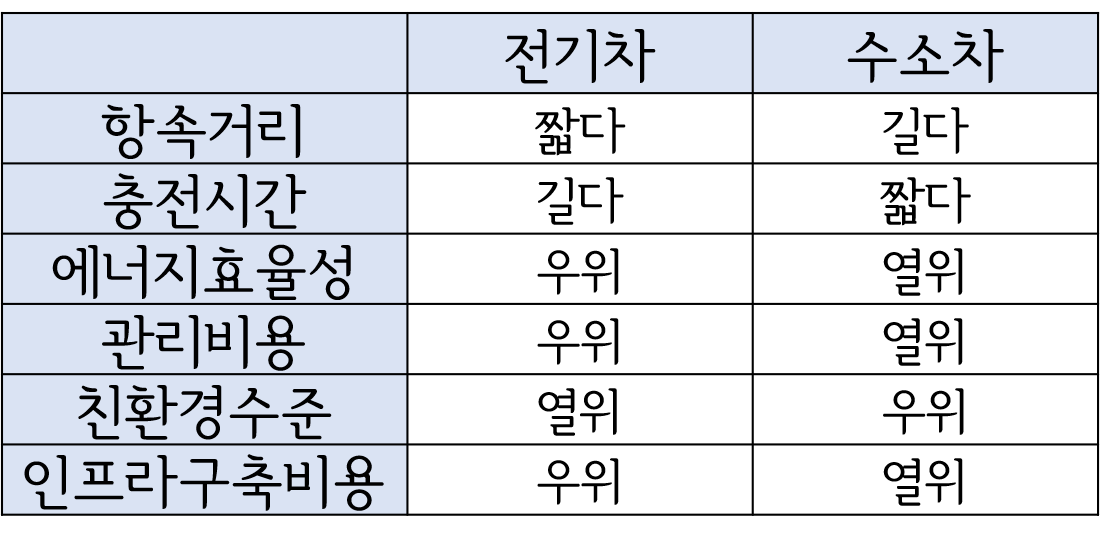 결론적으로 수소차가 우위냐, 전기차가 우위냐가 중요한 것이 아니라 정부의 정책 패러다임이 수소 에너지 활성화로 전환했다는 사실이 중요하다고 생각합니다. 수소차는 이러한 에너지 정책의 일부에 불과한 것입니다. 글 초반에서 전기차가 궁극적인 미래차가 될 수 없는 이유들을 나열했지만 미래의 기술 변화는 어떻게 일어날지 알 수는 없습니다. 최근 개발된 그래핀 기술이 어떻게 적용되느냐에 따라 전기차의 배터리 능력이 혁신적으로 향상될 수도 있습니다. 다만, 눈에 띄는 혁신적인 기술이 나타나지 않는 한 당분간 전기차와 수소차의 양자 구도로 갈 것으로 보입니다. 주행거리는 짧지만 저렴한 전기차는 소형차 위주로, 주행거리는 길지만 비싼 수소차는 대형차 위주로 활성화될 것으로 보입니다.