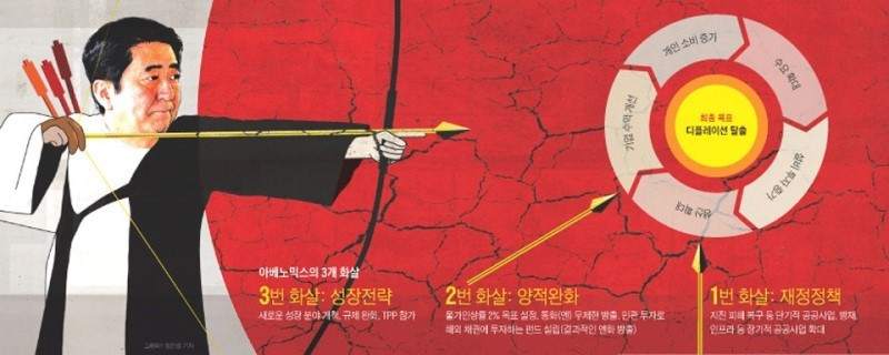 아베노믹스는 크게 3가지 화살이라고 불리는 정책적 전략을 바탕으로 하고 있습니다. 아베의 재집권 이후 실시한 1차 아베노믹스의 첫 번째 화살은 대담한 금융정책, 두 번째 화살은 적극적인 재정정책, 그리고 세 번째 화살은 민간투자를 유발하는 성장전략입니다.