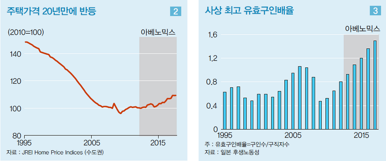 내부적으로 공격적인 경제정책과 우호적인 대외조건이 만나 일본 경제에는 어떠한 변화가 생겼을까요?