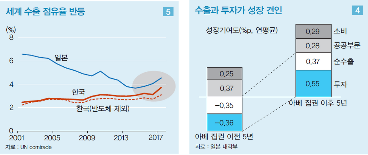 세 번째 방패는 세계 경기 회복과 그에 따른 글로벌 무역 증가입니다. 글로벌 금융위기 이후 침체됐던 경기가 미국의 경기 호황과 함께 신흥국도 동반 성장하면서 글로벌 무역이 증가했고, 아베의 적극적인 무역개방정책이 빛을 발할 수 있었습니다. 특히, 중국의 경제성장은 일본의 경제회복에 밑받침이 되었습니다. 일본은 장비 부품에 강점이 있는 나라이고, 중국의 제조업 고도화에 따라 중국의 일본 제품 수주가 증가했기 때문입니다.