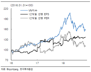 베트남 증시의 상승사이클이 나타난 만큼 또다시 대세 상승사이클이 나오려면 다소 시간이 걸릴 것으로 보입니다. EPS는 베트남 기업의 수익성을 보여주는 객관적 지표이고, PER은 투자자들이 베트남 기업의 가치를 어떻게 바라보느냐는 주관적 지표입니다. 글로벌 경기동향이 좋은 편은 아니기 때문에 베트남 기업의 EPS 전망이 좋을지라도, 당분간 PER이 얼마나 오를지는 미지수인 상황입니다. 따라서, 달러화 가치 하락기조가 시작되는 시점부터 다음 상승장이 실현될 것으로 보입니다.