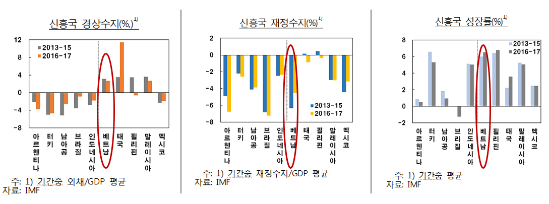 베트남의 성장률은 상승하고, 경상수지는 흑자를 유지하고 있으며 재정수지는 개선된 모습을 보여주고 있습니다. 또한, 외채 대비 충분한 외환보유고로 외환위기 가능성도 낮습니다. 기타 국가와 비교해 보았을 때 전반적으로 양호한 모습을 보여주고 있습니다.