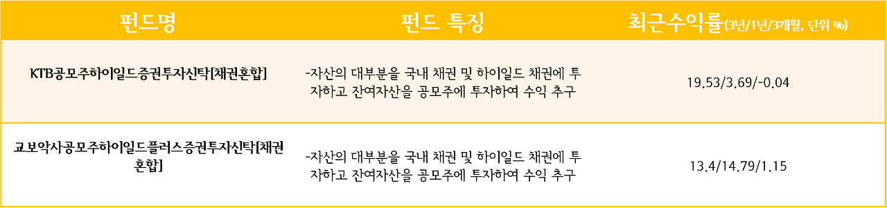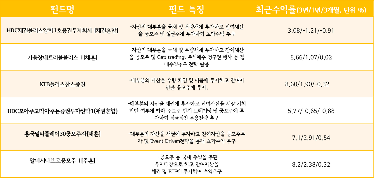 3. 공모주하이일드형 : 대부분의 자산을 채권에 투자하고 일부를 공모주나 고위험 하이일드 채권에 투자. 채권알파형 펀드와 달리 채권 자산을 우량 채권이 아닌 하이일드 채권(투기등급의 채권)에 투자하여 추가 수익 추구함.