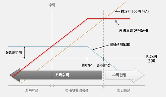 커버드 콜은 주식(선물) 매수 포지션과 콜 옵션 매도 포지션을 함께 취한 전략입니다.