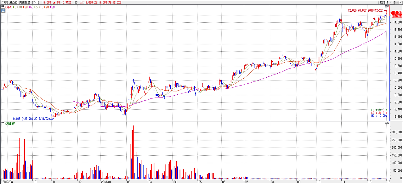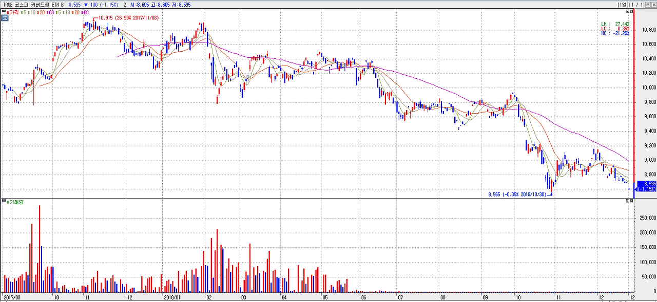 위 그래프는 ‘TRUE 코스피 커버드콜 ETN B’의 추이를 나타낸 그래프입니다. 최근 하락 장세로 인해 우하향한 모습을 보여주고 있습니다.