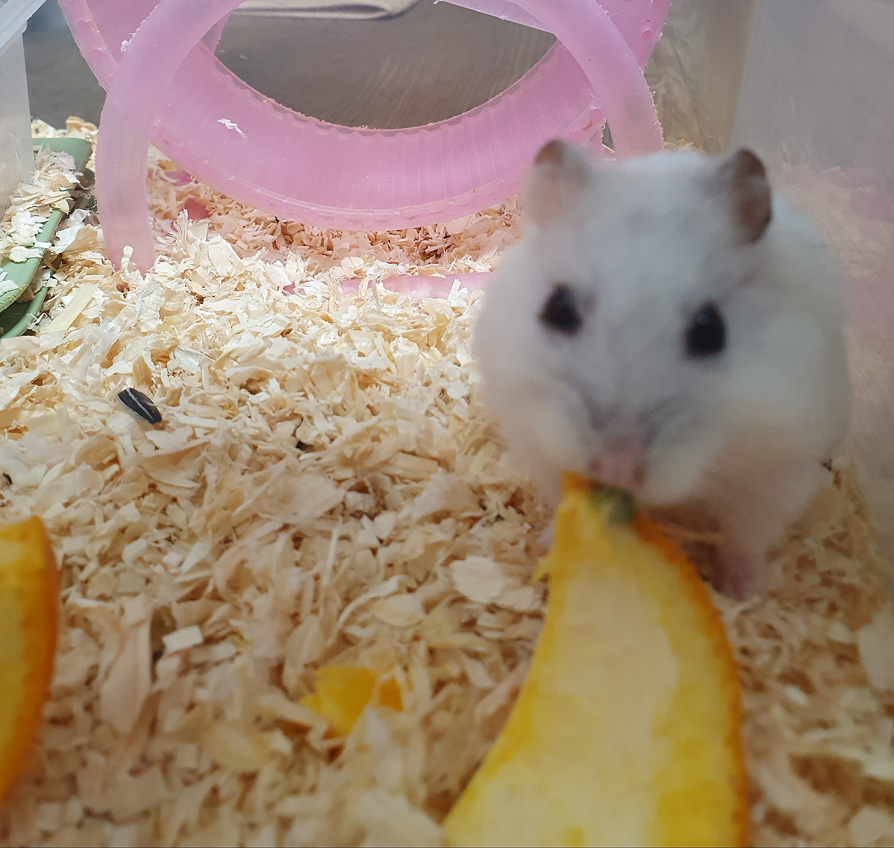 둘이 급수기안의 작은 공간에 쏙 들어가 있기도 하고 사이좋게 오렌지를 먹기도 해요. 매장에서는 먹는 것도 시원찮았을 테니 해씨 뿐 아니라 아주 잘 먹어요.