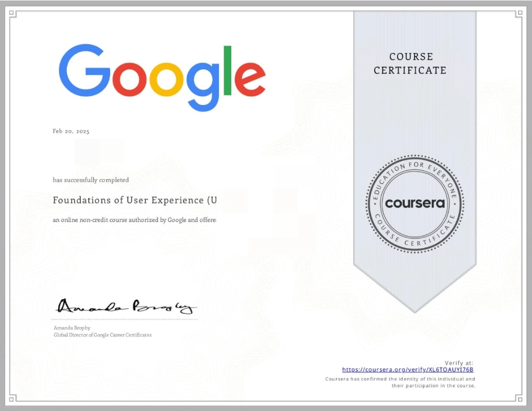 그러나 필자는 현재 해외에 있기 때문에 국내에서 진행되는 국비 과정, 부트캠프 등에 참여하기 어려웠고, 한국에서 UX서적을 몇 권 구매해서 혼자 읽으며 독학하는 것이 전부였다. 그러나 책은 내용이 쉽게 이해되지 않았고, 유튜브 강의는 대체로 짧고 깊이가 얕았다. 그러던 중 인터넷에서 구글 코세라에서 진행하는 강의가 있음을 알게 되어 기쁜 마음으로 수강하게 되었다.