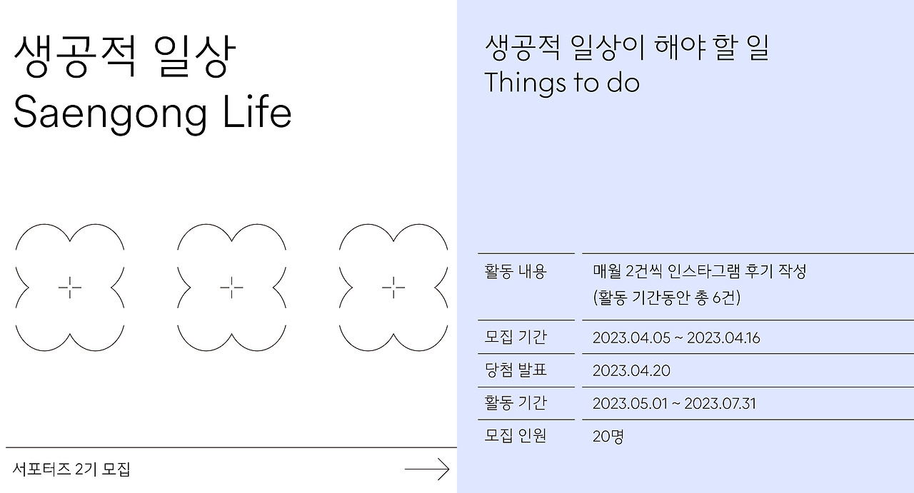 생공적 일상 서포터즈 2기는 오는 4월 16일(일)까지 공식 인스타그램 계정 프로필 링크에 연동된 네이버 폼을 통해 신청 가능하다. 평소 생활용품에 관심이 많고 개인 인스타그램 활동이 활발한 사람이라면 누구나 참여할 수 있다.
