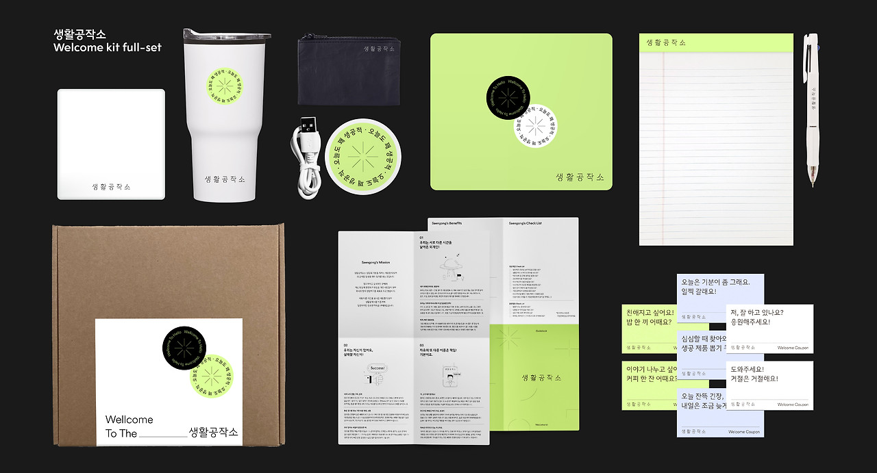 웰컴키트 내 구성품부터 살펴보자. 왼쪽 상단부터 시계방향으로 연필꽂이, 텀블러, 동전지갑(이라 읽고, 명함 지갑으로 사용하자), 무선 충전기, 마우스패드, 삼색 볼펜, 메모지! 이렇게 준비되어 있다. 구성품들은 별것 아니어 보이지만 실제로 효율적인 업무를 위해 가장 필요한 것들로만 선정했다. 다소 밋밋하고 취향을 탈 수 있는 디자인에 브랜드의 컬러와 정체성을 담아 시각적으로 즐거움을 더한 것이 특징이다. 하얗기만 한 생활공작소라고? 전-혀. 저 발랄하고 활기찬 컬러도 생활공작소의 포인트 컬러 중 하나다.
