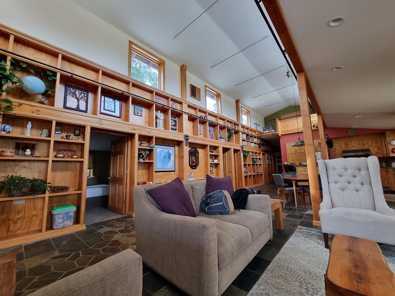 거실에도 곳곳에 수납장이 있고 각종 용품들이 들어 있다. 둥근 식탁이 있고 소파와 벽난로가 있다.
