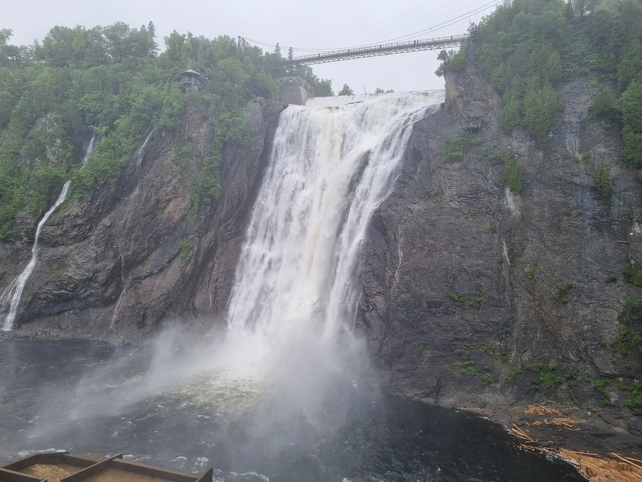 몽모렌시 폭포 $45 케이블카를 타고 아주 잠깐 올라갔다. 비가 오니 빨간 우산이 예쁘다. 나이아가라 폭포를 본 후의 몽모렌시 폭포는 감동이 덜했다. 물이 검게 보였는데 바닥이 커다란 바위 하나로 이루어져있다고 한다. 사진 몇 장 찍고 나니 언니네 시어머니 돌아가셨다는 연락을 받았다. 10년 동안 누워 계시기에 자유로이 외출을 못했는데 우리와 여행 중 돌아가시니 미안한 마음이다. 뉴욕으로 가는 빠른 교통편이 있을까 하고 가이드에게 물어보니 없다고