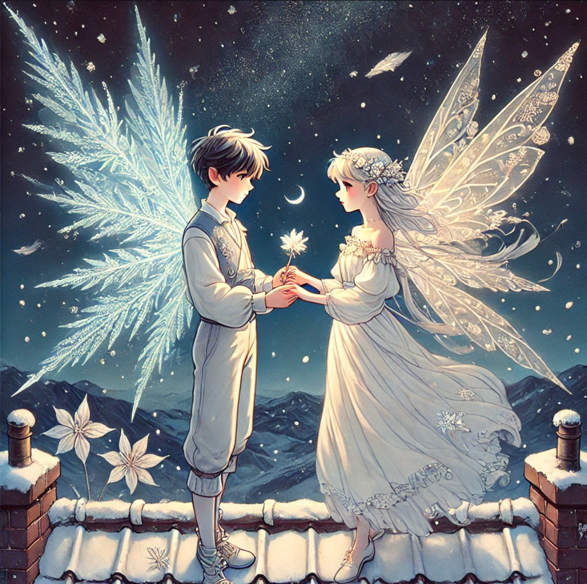 차가운 눈발이 되어 세상을 얼려도 우리만은 따스한 체온으로 세상에 온기를 전하자고. 그리고 이브 자정에 눈송이 요정과 눈꽃요정은 꼭 1년 만에 다시 만났답니다. 그리고 둘은 손을 꼭 붙잡고 겨울왕국 곳곳의 지붕에 내려앉았어요. 그리고 추위에 덜덜 떠는 다른 눈송이 요정들에게 따스한 온기와 사랑을 전파했답니다. 바로 몸 안에 간직한 양초와 핫팩을 숨겨서요.
