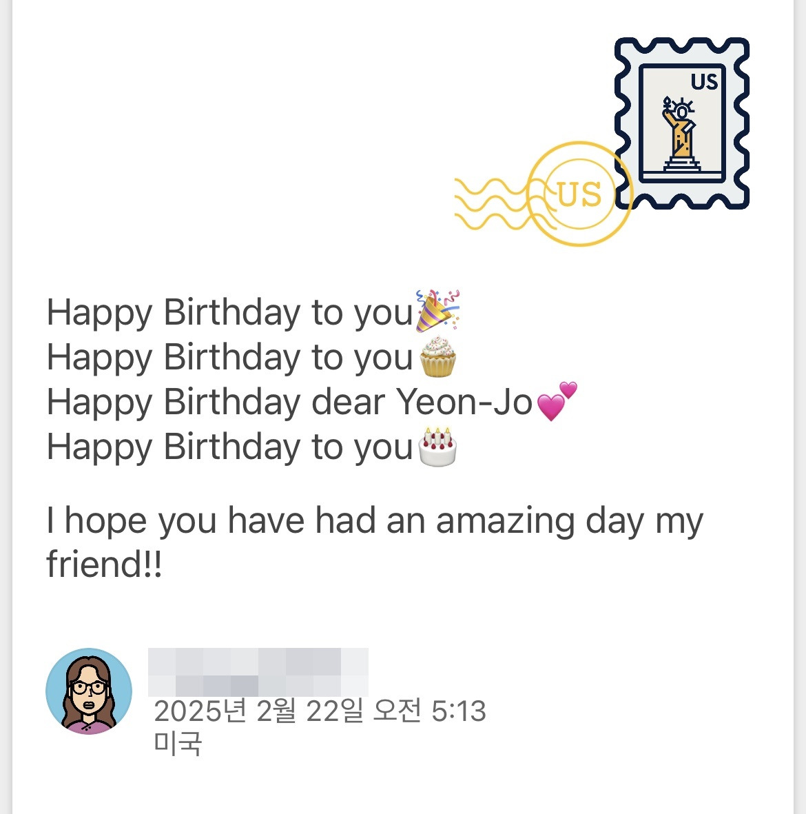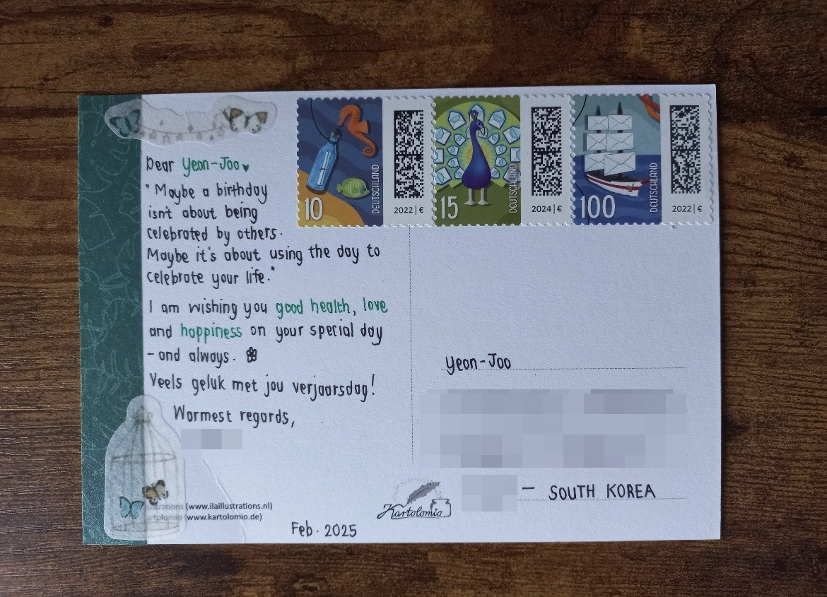 독일 사는 친구하고는 둘 다 물고기자리로 생일이 비슷해서 실제 항공우편도 주고받았다. 나는 쿠팡에서 혼례복을 입은 남녀 인형을 선물로 보냈고 친구는 내게 예쁜 우표를 붙인 정성스럽게 쓴 엽서를 보내주었다. 앞으로 다른 친구와도 우편엽서도 교환하고 싶다. 일상의 작은 기쁨이다.