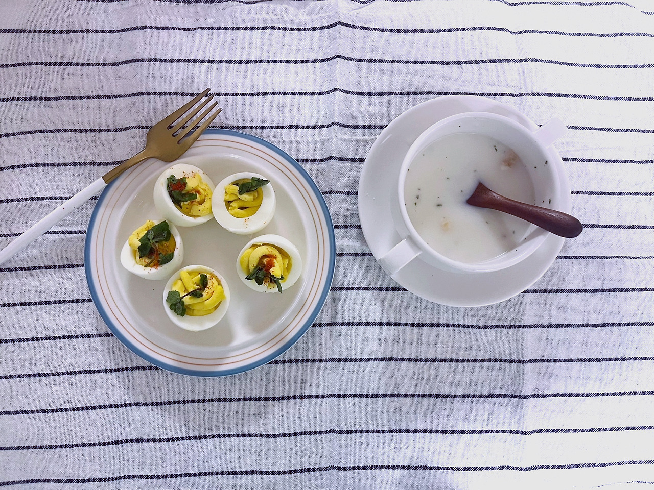 퇴근 후 집에 와서 제일 먼저 어질러진 침실과 욕실을 청소하고 쌓여있는 설거지를 하고, 미리 사놓은 재료를 가지고 요리를 해보았다. 오늘의 요리는 데빌드 에그. 스터프드 에그라고도 한다. 아주 초간단 요리이다. 계란을 삶고 반을 갈라서 속을 비운 후, 노른자와 마요네즈와 설탕, 소금 등을 섞은 후, 짤주머니를 이용해 흰자 속에 예쁘게 짜준 후, 허브와 페퍼가루로 장식해 주면 된다.