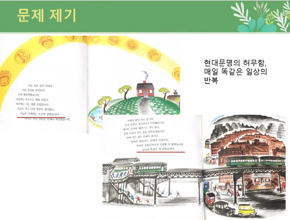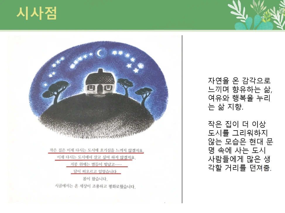 작품은 자연 속에서 느끼는 행복과 평화로움이 회복될 수 있음을 보여준다. 작은 집이 더 이상 도시를 그리워하지 않는 모습은, 독자에게 ‘어떤 삶이 진정 행복한가’라는 질문을 던진다.